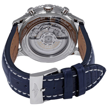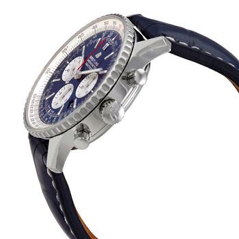 Stainless steel case with a blue (crocodile) leather strap. Bi-directional rotating stainless steel bezel. Blue dial with luminoius silver-tone hands and index hour markers. Minute markers. Slide rule aka "navigation computer" markers around the outer rim. Dial Type: Analog. Luminescent hands and markers. Date display between the 4 and 5 o'clock positions. Chronograph - three white sub-dials displaying: 60 second, 30 minute and 12 hour. Breitling Calibre 01 Automatic movement, containing 47 Jewels, composed of 346 parts, bitting at 28800 vph, and has a power reserve of approximately 70 hours. Scratch resistant sapphire crystal. Pull / push crown. Transparent case back. Round case shape. Case size: 46 mm. Case thickness: 14.51 mm. Band width: 24 mm. Band length: 7 inches. Tang clasp. Water resistant at 30 meters / 100 feet. Functions: chronograph, column wheel, date, hour, minute, second, chronometer. Navitimer 1 Series. Luxury watch style. Watch label: Swiss Made. Breitling Navitimer 1 Chronograph Automatic Chronometer Men's Watch AB012721-CA05-746P-A20BA.1.