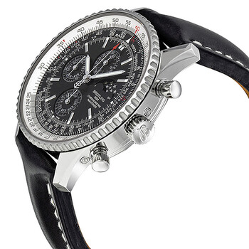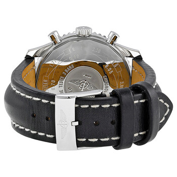 Silver-tone stainless steel case with a black leather strap. Bi-directional rotating slide rule silver-tone stainless steel bezel. Black dial with silver-tone hands and stick hour markers. Slide rule aka "navigation computer" around the outer rim. Dial Type: Analog. Luminescent hands and markers. Leap-year calendar. Chronograph - three sub-dials displaying: 60 second / date, 30 minute / month and 12 hour / day of the week. Breitling Calibre 19 automatic movement with a 42-hour power reserve. Scratch resistant sapphire crystal. Pull / push crown. Solid case back. Round case shape, case size: 46 mm, case thickness: 15.5 mm. Band width: 24 mm. Tang clasp. Water resistant at 30 meters / 100 feet. Functions: chronograph, moonpase, month, date, day, hour, minute, second, chronometer. Luxury watch style. Watch label: Swiss Made. Breitling Navitimer 1461 Chronograph Automatic Black Dial Men's Watch A1937012-BA57.