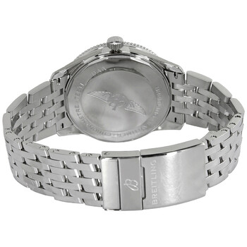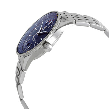 Stainless steel case with a stainless steel bracelet. Bi-directional rotating stainless steel bezel. Blue dial with luminous silver-tone hands and index hour markers. Minute markers. Slide rule markings around the outer rim. Dial Type: Analog. Luminescent hands and markers. Date display at the 6 o'clock position. Breitling calibre 17 automatic movement, based upon ETA 2824-2, containing 25 Jewels, bitting at 28800 vph, and has a power reserve of approximately 42 hours. Scratch resistant sapphire crystal. Pull / push crown. Solid case back. Round case shape. Case size: 41 mm. Case thickness: 10 mm. Band width: 22 mm / 20 mm. Fold over clasp with a push button release. Water resistant at 30 meters / 100 feet. Functions: date, hour, minute, second. Navitimer Series. Luxury watch style. Watch label: Swiss Made. Breitling Navitimer 41 Automatic Blue Dial Men's Watch A17326161C1A1.