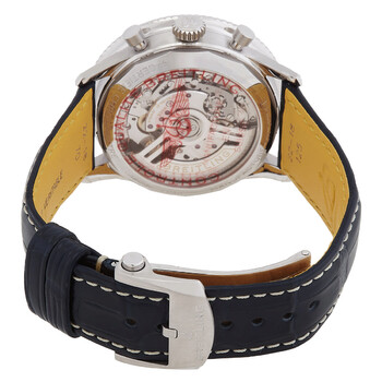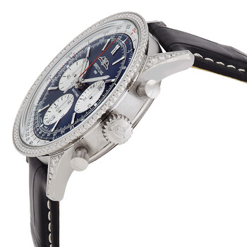Silver-tone stainless steel diamond set case with a blue leather strap. Bi-directional rotating silver-tone bezel with diamond set. Blue dial with silver-tone hands and index-Arabic numeral hour markers. Minute markers around the outer rim. Dial Type: Analog. Luminescent hands and markers. Date display at the 6 o'clock position. Chronograph - three sub-dials displaying: 60 second, 30 minute and 1/10th of a second. Breitling Calibre 01 Automatic movement, containing 47 Jewels, composed of 346 parts, bitting at 28800 vph, and has a power reserve of approximately 70 hours. Scratch resistant sapphire crystal. Transparent see through case back. Round case shape, case size: 41 mm, case thickness: 13.6 mm. Folding clasp. Water resistant at 30 meters / 100 feet. Functions: chronograph, date, hour, minute, second. Navitimer B01 Series. Dress watch style. Watch label: Swiss Made. Breitling Navitimer B01 Chronograph Automatic Diamond Blue Dial Watch AB0139631C1P1.