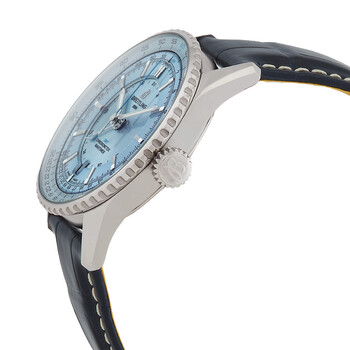 Silver-tone stainless steel case with a blue alligator leather strap. Fixed silver-tone stainless steel bezel. Blue dial with silver-tone hands and index hour markers. Minute scale around the inner rim. Dial Type: Analog. Luminescent hands and markers. Date display at the 6 o'clock position. Breitling Calibre 32 Automatic movement, based upon ETA 2893-2, containing 21 Jewels, bitting at 28800 vph, and has a power reserve of approximately 42 hours. Scratch resistant sapphire crystal. Screw down crown. Solid case back. Round case shape, case size: 41 mm, case thickness: 11.6 mm. Band width: 22 mm. Folding clasp. Water resistant at 30 meters / 100 feet. Functions: date, hour, minute, second. Navitimer Series. Sport watch style. Watch label: Swiss Made. Breitling Navitimer Automatic Blue Dial Men's Watch A32310171C1P1.