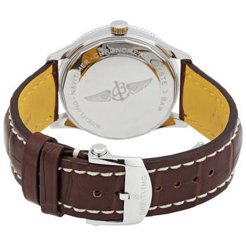 Silver-tone stainless steel case with a brown alligator/crocodile leather strap. Uni-directional rotating silver-tone stainless steel bezel. Blue dial with silver-tone hands and index hour markers. Minute markers around the outer rim. Dial Type: Analog. Luminescent hands. Date display at the 6 o'clock position. Breitling Calibre 17 Automatic movement, based upon ETA 2824-2, containing 25 Jewels, bitting at 28800 vph, and has a power reserve of approximately 42 hours. Scratch resistant sapphire crystal. Pull / push crown. Solid case back. Round case shape, case size: 41 mm, case thickness: 10.10 mm. Push button deployant buckle clasp. Water resistant at 30 meters / 100 feet. Functions: date, hour, minute, second, chronometer. Navitimer Series. Luxury watch style. Watch label: Swiss Made. Breitling Navitimer Automatic Chronometer Blue Dial Men's Watch a17326161c1p2.