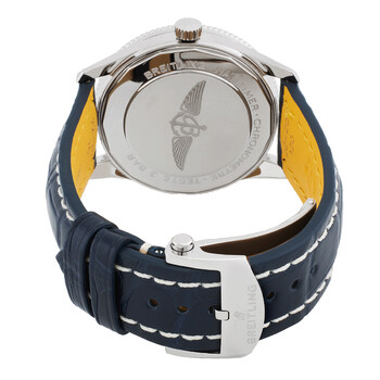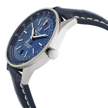 Silver-tone stainless steel case with a blue alligator/crocodile leather strap. Uni-directional rotating silver-tone stainless steel bezel. Blue dial with silver-tone hands and index hour markers. Navitimer scale around the outer rim. Dial Type: Analog. Luminescent hands. Date display at the 6 o'clock position. Breitling Calibre 17 Automatic movement, based upon ETA 2824-2, containing 25 Jewels, bitting at 28800 vph, and has a power reserve of approximately 42 hours. Scratch resistant sapphire crystal. Pull / push crown. Solid case back. Round case shape, case size: 41 mm, case thickness: 10.10 mm. Push button deployant buckle clasp. Water resistant at 30 meters / 100 feet. Functions: date, hour, minute, second, chronometer. Navitimer Series. Luxury watch style. Watch label: Swiss Made. Breitling Navitimer Automatic Chronometer Blue Dial Men's Watch a17326161c1p4.