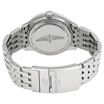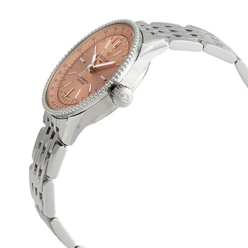 Stainless steel case with a stainless steel bracelet. Uni-directional rotating stainless steel bezel. Copper dial with luminous silver-tone hands and index hour markers. Miles per hour / kilometer conversion scale around the outer rim. Dial Type: Analog. Luminescent hands. Breitling calibre 17 automatic movement, based upon ETA 2824-2, containing 25 Jewels, bitting at 28800 vph, and has a power reserve of approximately 42 hours. Scratch resistant sapphire crystal. Screw down crown. Solid case back. Round case shape. Case size: 35 mm. Case thickness: 10 mm. Band width: 18 mm. Deployment clasp. Water resistant at 30 meters / 100 feet. Functions: date, hour, minute, second, chronometer. Navitimer Series. Luxury watch style. Watch label: Swiss Made. Breitling Navitimer Automatic Chronometer Cooper Dial Ladies Watch A17395201K1A1.