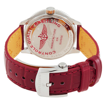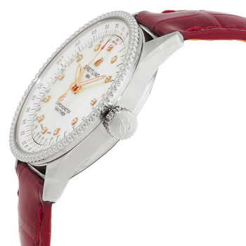 Silver-tone stainless steel case with a red alligator leather strap. Bi-directional rotating silver-tone stainless steel bezel. White mother of pearl dial with rose gold-tone hands and diamond hour markers. Minute markers around the outer rim. Dial Type: Analog. Breitling Calibre 17 Automatic movement, based upon ETA 2824-2, containing 25 Jewels, bitting at 28800 vph, and has a power reserve of approximately 42 hours. Scratch resistant sapphire crystal. Pull / push crown. Solid case back. Round case shape, case size: 35 mm, case thickness: 9.92 mm. Band width: 18 mm. Folding clasp. Water resistant at 30 meters / 100 feet. Functions: hour, minute, second, chronometer. Navitimer Series. Dress watch style. Watch label: Swiss Made. Breitling Navitimer Automatic Chronometer Diamond White Mother of Pearl Dial Ladies Watch A17395211A1P6.