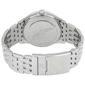Silver-tone stainless steel case and bracelet. Bi-directional rotating silver-tone stainless steel bezel. Green dial with silver-tone hands and index hour markers. Minute markers around the outer rim. Dial Type: Analog. Luminescent hands and markers. Date display at the 6 o'clock position. Breitling Calibre 17 Automatic movement, based upon ETA 2824-2, containing 25 Jewels, bitting at 28800 vph, and has a power reserve of approximately 42 hours. Scratch resistant sapphire crystal. Pull / push crown. Solid case back. Round case shape, case size: 41 mm, case thickness: 10 mm. Band width: 22 mm. Fold over clasp with a safety release. Water resistant at 30 meters / 100 feet. Functions: date, hour, minute, second, chronometer. Navitimer Series. Luxury watch style. Watch label: Swiss Made. Breitling Navitimer Automatic Chronometer Green Dial Men's Watch A17326361L1A1.