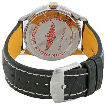 Silver-tone stainless steel case with a green alligator band. Bi-directional rotating silver-tone stainless steel bezel. Green dial with silver-tone hands and index hour markers. Minute markers around the outer rim. Dial Type: Analog. Luminescent hands and markers. Date display at the 6 o'clock position. Breitling Calibre 17 Automatic movement, based upon ETA 2824-2, containing 25 Jewels, bitting at 28800 vph, and has a power reserve of approximately 42 hours. Scratch resistant sapphire crystal. Pull / push crown. Solid case back. Round case shape, case size: 41 mm. Tang. Water resistant at 30 meters / 100 feet. Functions: date, hour, minute, second, chronometer. Additional Info: original box, international warranty card, manual (complete accessories). Navitimer Series. Luxury watch style. Watch label: Swiss Made. Breitling Navitimer Automatic Chronometer Green Dial Men's Watch A17326361L1P1.
