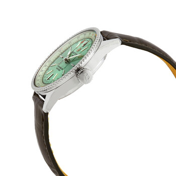 Silver-tone stainless steel case with a green leather strap. Bi-directional rotating silver-tone stainless steel bezel. Green dial with silver-tone hands and index hour markers. Minute markers around the outer rim. Dial Type: Analog. Luminescent hands and markers. Breitling Calibre 17 Automatic movement, based upon ETA 2824-2, containing 25 Jewels, bitting at 28800 vph, and has a power reserve of approximately 42 hours. Scratch resistant sapphire crystal. Pull / push crown. Solid case back. Round case shape, case size: 35 mm, case thickness: 9.9 mm. Tang clasp. Water resistant at 30 meters / 100 feet. Functions: hour, minute, second, chronometer. Navitimer Series. Luxury watch style. Watch label: Swiss Made. Breitling Navitimer Automatic Chronometer Green Dial Unisex Watch A17395361L1P2.