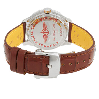 Stainless steel case with a brown (alligator) leather strap. Uni-directional rotating stainless steel bezel. Copper dial with luminous silver-tone hands and index hour markers. Navitimer scale around the outer rim. Dial Type: Analog. Luminescent hands. Breitling calibre 17 automatic movement, based upon ETA 2824-2, containing 25 Jewels, bitting at 28800 vph, and has a power reserve of approximately 42 hours. Scratch resistant sapphire crystal. Pull / push crown. Solid case back. Round case shape. Case size: 35 mm. Case thickness: 9.92 mm. Band width: 18 mm / 16 mm. Fold over clasp. Water resistant at 30 meters / 100 feet. Functions: hour, minute, second, chronometer. Navitimer Series. Luxury watch style. Watch label: Swiss Made. Breitling Navitimer Automatic Chronometer Ladies Watch A17395201K1P2.