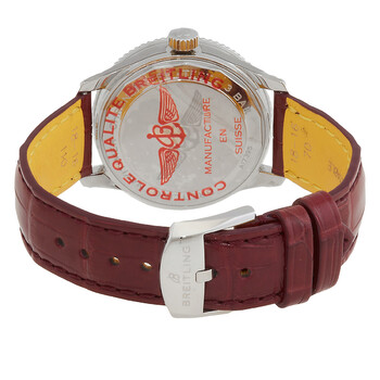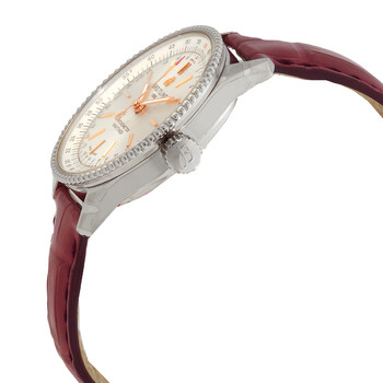 Stainless steel case with a burgundy leather strap. Uni-directional rotating stainless steel bezel. Silver dial with luminous rose gold-tone hands and index hour markers. Navitimer scale around the outer rim. Dial Type: Analog. Luminescent hands. Breitling calibre 17 automatic movement, based upon ETA 2824-2, containing 25 Jewels, bitting at 28800 vph, and has a power reserve of approximately 42 hours. Scratch resistant sapphire crystal. Pull / push crown. Solid case back. Round case shape. Case size: 35 mm. Case thickness: 10 mm. Tang clasp. Water resistant at 30 meters / 100 feet. Functions: hour, minute, second, chronometer. Navitimer Series. Luxury watch style. Watch label: Swiss Made. Breitling Navitimer Automatic Chronometer Silver Dial Ladies Watch A17395F41G1P1.