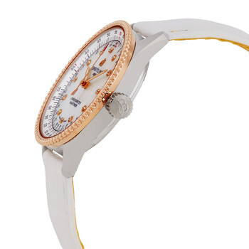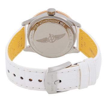 Rose gold-tone stainless steel & rose gold case with a white crocodile leather strap. Bi-directional rotating rose gold-tone 18kt rose gold bezel. Mother of pearl dial with rose gold-tone hands and index-Arabic numeral hour markers. Minute markers around the outer rim. Dial Type: Analog. Luminescent hands and markers. Breitling Calibre 17 Automatic movement, based upon ETA 2824-2, containing 25 Jewels, bitting at 28800 vph, and has a power reserve of approximately 42 hours. Scratch resistant sapphire crystal. Pull / push crown. Solid case back. Round case shape, case size: 35 mm, case thickness: 9.92 mm. Band width: 18 mm. Buckle clasp. Water resistant at 30 meters / 100 feet. Functions: hour, minute, second. Navitimer Series. Luxury watch style. Watch label: Swiss Made. Breitling Navitimer Automatic Ladies Watch U17395211A1P3.