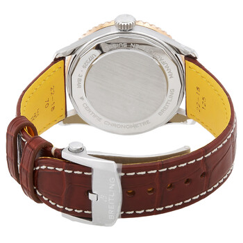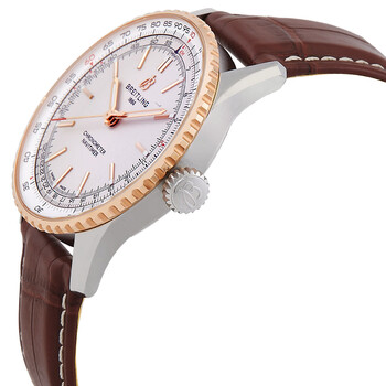 Rose gold-tone 18kt rose gold case with a gold brown leather strap. Bi-directional rotating rose gold-tone 18kt rose gold bezel. Beige dial with rose gold-tone hands and index hour markers. Minute markers around the outer rim. Dial Type: Analog. Luminescent hands and markers. Breitling Calibre 17 Automatic movement, based upon ETA 2824-2, containing 25 Jewels, bitting at 28800 vph, and has a power reserve of approximately 42 hours. Scratch resistant sapphire crystal. Solid case back. Round case shape, case size: 41 mm, case thickness: 11.6 mm. Band width: 22 mm. Tang clasp. Water resistant at 30 meters / 100 feet. Functions: hour, minute, second. Navitimer Series. Sport watch style. Watch label: Swiss Made. Breitling Navitimer Automatic Men's Watch U17329F41G1P1.