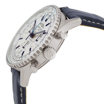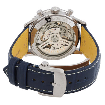 Silver-tone stainless steel case with a blue leather strap. Bi-directional rotating silver-tone stainless steel bezel. Beige dial with blued hands and index-Arabic numeral hour markers. Minute markers around the outer rim. Dial Type: Analog. Luminescent hands and markers. Date display at the 6 o'clock position. Chronograph - three sub-dials displaying: 60 second, 30 minute and 1/10th of a second. Breitling Calibre 01 Automatic movement, containing 47 Jewels, composed of 346 parts, bitting at 28800 vph, and has a power reserve of approximately 70 hours. Scratch resistant sapphire crystal. Screw down crown. Transparent see through case back. Round case shape, case size: 41 mm, case thickness: 13.6 mm. Band width: 22 mm. Fold over clasp with a safety release. Water resistant at 30 meters / 100 feet. Functions: chronograph, date, hour, minute, second. Navitimer B01 Series. Dress watch style. Watch label: Swiss Made. Breitling Navitimer B01 Chronograph Automatic Men's Watch AB0139A71G1P1.