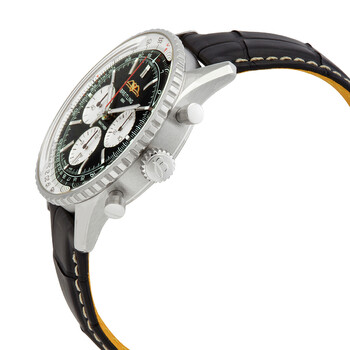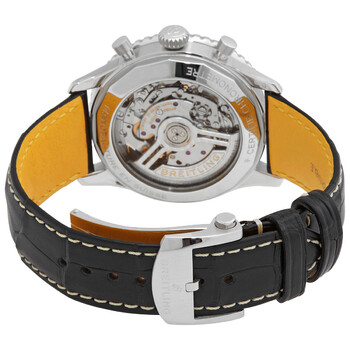 Stainless steel case with a black (alligator) leather strap. Bi-directional rotating stainless steel bezel. Black dial with luminous silver-tone hands and index hour markers. Minute markers. Slide rule markings around the outer rim. Dial Type: Analog. Luminescent hands and markers. Date display above the 6 o'clock position. Chronograph - three sub-dials displaying: 60 second, 30 minute and 12 hour. Breitling calibre 01 automatic movement, containing 47 Jewels, composed of 346 parts, bitting at 28800 vph, and has a power reserve of approximately 70 hours. Scratch resistant sapphire crystal. Pull / push crown. Transparent case back. Round case shape. Case size: 43 mm. Case thickness: 13.6 mm. Band width: 22 mm. Deployment with push button release clasp. Water resistant at 30 meters / 100 feet. Functions: chronograph, column wheel, date, hour, minute, second, chronometer. Navitimer Series. Luxury watch style. Watch label: Swiss Made. Breitling Navitimer Chronograph Automatic Chronometer Black Dial Men's Watch AB0138211B1P1.