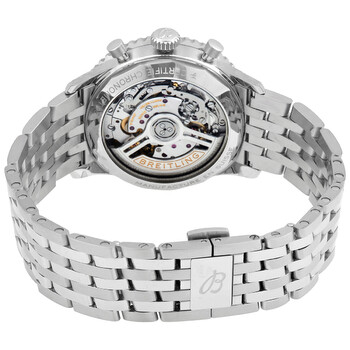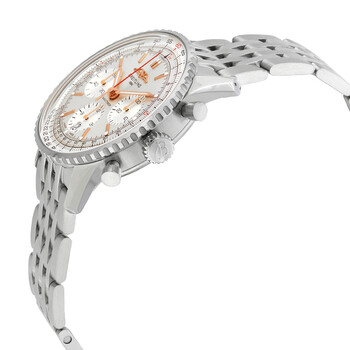 Silver-tone stainless steel case and bracelet. Bi-directional rotating silver-tone stainless steel bezel. Silver-tone dial with rose gold-tone hands and index hour markers. Minute markers around the outer rim. Dial Type: Analog. Luminescent hands and markers. Date display at the 6 o'clock position. Chronograph - three sub-dials displaying: 60 second, 30 minute and 12 hour. Breitling Calibre 01 Automatic movement, containing 47 Jewels, composed of 346 parts, bitting at 28800 vph, and has a power reserve of approximately 70 hours. Scratch resistant sapphire crystal. Pull / push crown. Transparent see through case back. Round case shape, case size: 41 mm. Deployment with push button release clasp. Water resistant at 30 meters / 100 feet. Functions: chronograph, column wheel, date, hour, minute, second, chronometer. Additional Info: original box, manual (complete accessories). Navitimer Series. Luxury watch style. Watch label: Swiss Made. Breitling Navitimer Chronograph Automatic Chronometer Silver Dial Men's Watch AB0139211G1A1.