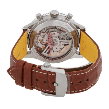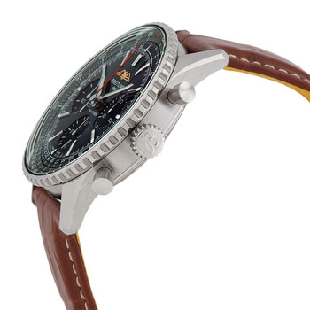 Silver-tone stainless steel case with a brown alligator leather strap. Bi-directional rotating silver-tone stainless steel bezel. Green dial with silver-tone hands and index hour markers. Minute markers around the outer rim. Dial Type: Analog. Luminescent hands. Date display at the 6 o'clock position. Chronograph - three sub-dials displaying: 60 second, 30 minute and 12 hour. Breitling Calibre 01 Automatic movement, containing 47 Jewels, composed of 346 parts, bitting at 28800 vph, and has a power reserve of approximately 70 hours. Scratch resistant sapphire crystal. Pull / push crown. Transparent case back. Round case shape, case size: 43 mm, case thickness: 13.6 mm. Band width: 22 mm, band length: 43 inches. Folding clasp. Water resistant at 30 meters / 100 feet. Functions: chronograph, column wheel, date, hour, minute, second, chronometer. Navitimer Series. Sport watch style. Watch label: Swiss Made. Breitling Navitimer Chronograph Automatic Chronometer Green Dial Men's Watch AB01382B1L1P1.