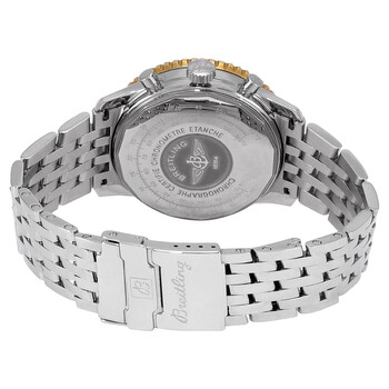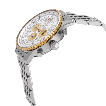 Silver-tone stainless steel case and bracelet. Bi-directional rotating bezel. White dial with gold-tone hands and Arabic numeral hour markers. Dial Type: Analog. Luminescent hands and markers. Date display between 4 and 5 o'clock position. Chronograph - three sub-dials displaying: 60 second, 30 minute and 12 hours. Automatic movement with a 42-hour power reserve. Scratch resistant sapphire crystal. Round case shape, case size: 41.5 mm. Deployment clasp. Water resistant at 30 meters / 100 feet. Functions: chronograph, date, hour, minute, second. Navitimer Cosmonaute Series. Luxury watch style. Watch label: Swiss Made. Breitling Navitimer Cosmonaute Chronograph Automatic White Dial Men's Watch D2232212/B567.