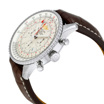 Stainless steel case with a brown embossed leather strap. Bi-directional rotating stainless steel bezel. Silver dial with luminous hands and index hour markers. Minute markers. 24 hour markers. Slide rule markers around the outer rim. Dial Type: Analog. Luminescent hands and markers. Date display between the 4 and 5 o'clock positions. Chronograph - three sub-dials displaying: 60 second, 30 minute and 12 hour. Automatic movement with a 70-hour power reserve. Scratch resistant sapphire crystal. Pull / push crown - two gaskets. Skeleton case back. Case diameter: 48 mm. Case thickness: 15.80 mm. Round case shape. Band width: 24 mm / 20 mm. Tang clasp. Water resistant at 30 meters / 100 feet. Functions: GMT, date, second time zone, hour, minute, second. Luxury watch style. Watch label: Swiss Made. Item Variations: AB044121/G783 756P-A20BA.1. Breitling Navitimer GMT Automatic Silver Dial Brown Leather Men's Watch AB044121-G783BRCT.