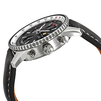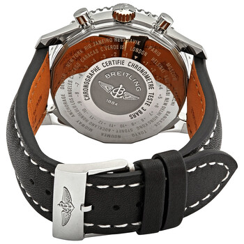 Stainless steel case with a black leather strap. Bi-directional rotating stainless steel bezel. Black dial with luminous silver-tone hands and index hour markers. Minute markers. 24 hour markers. Slide rule markings around the outer rim. Dial Type: Analog. Luminescent hands and markers. Date display at the 3 o'clock position. Chronograph - three sub-dials displaying: 60 second, 30 minute and 12 hour. Breitling caliber 24 automatic movement. Scratch resistant sapphire crystal. Pull / push crown. Solid case back. Round case shape. Case size: 46 mm. Case thickness: 15.5 mm. Band width: 24 mm / 20 mm. Tang clasp. Water resistant at 30 meters / 100 feet. Functions: chronograph, date, hour, minute, second. Luxury watch style. Watch label: Swiss Made. Additional Information: The "Slide Rule" aka "Navigation Computer" which allows to compute different airborne calculations such as fuel consumption, climbing times & converting miles into nautical miles or kilometers. Breitling Navitimer GMT Chronograph Automatic 46 mm Leather Men's Watch A24322121B2X1.