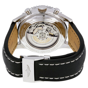 Stainless steel case with a black leather strap. Bi-directional rotating stainless steel bezel. Black and white dial with luminous silver-tone hands and index hour markers. Minute markers. 24 hour markers. "Slide rule" markings around the outer rim. Dial Type: Analog. Luminescent hands and markers. Date display between 4 and 5 o'clock position. Chronograph - three silver sub-dials displaying: 60 second, 30 minute and 12 hour. Breitling calibre 04 automatic movement with a 70-hour power reserve. Scratch resistant sapphire crystal. Pull / push crown. Transparent case back. Round case shape. Case size: 48 mm. Case thickness: 15.8 mm. Band width: 22 mm / 20 mm. Deployment clasp. Water resistant at 100 meters / 330 feet. Functions: chronograph, date, hour, minute, second, GMT, second time zone, chronometer. Additional Info: slide rule" aka "navigation computer". the slide-rule complication can compute different airborne calculations such as fuel consumption, climbing time converting miles into nautical miles or kilometers. Luxury watch style. Watch label: Swiss Made. Breitling Navitimer GMT Chronograph Automatic Men's Watch AB044121-BD24-442X-A20D.1.