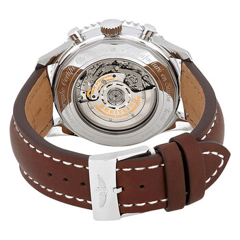 Silver-tone stainless steel case with a brown leather strap. Bi-directional rotating slide rule silver-tone stainless steel bezel. Mercury silver dial with luminous hands and index hour markers. Slide rule aka "navigation computer" around the outer rim. Dial Type: Analog. Luminescent hands and markers. Date display between 4 and 5 o'clock position. Chronograph - three sub-dials displaying: 60 second, 30 minute and 12 hour. Breitling Calibre 04 automatic movement with a 70-hour power reserve. Scratch resistant sapphire crystal. Skeleton transparent exhibition see through case back. Round case shape, case size: 48 mm, case thickness: 15.8 mm. Tang clasp. Water resistant at 30 meters / 100 feet. Functions: chronograph, date, hour, minute, second, GMT, second time zone, chronometer. Luxury watch style. Watch label: Swiss Made. Breitling Navitimer GMT Chronograph Brown Leather Men's Watch AB044121-G783BRLT.