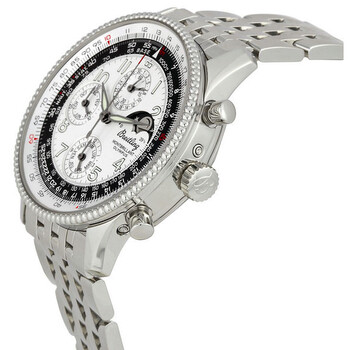 Silver-tone stainless steel case with a silver-tone stainless steel bracelet. Bi-directional rotating slide rule silver-tone stainless steel bezel. Silver dial with luminous hands and luminous numbers hour markers. Slide rule markers around the outer rim. Dial Type: Analog. Luminescent hands and dial markers. Leap-year calendar. Four sub-dials displaying: 60 second/date, 30 minute/month, 12 hour/day of the week and moonphase. Breitling Calibre 19 Automatic movement, based upon ETA 2892-A2, containing 38 Jewels, bitting at 28800 vph, and has a power reserve of approximately 42 hours. Scratch resistant sapphire crystal. Screw in crown. Solid case back. Round case shape, case size: 42.10 mm, case thickness: 14.7 mm. Band width: 22 mm, band length: 8.5 inches. Hidden deployment clasp. Water resistant at 30 meters / 100 feet. Functions: chronograph, moonpase, month, date, day, hour, minute, second, chronometer. Additional Info: 42 hour power reserve, moonphase indicator, chronograph. Montbrilliant Olympus Series. Sport watch style. Item Variations: A1935012. Breitling Navitimer Montbrillant Olympus Men's Watch A1935012-G592SS.