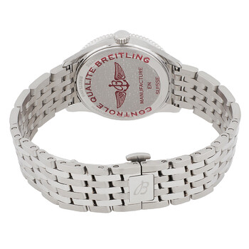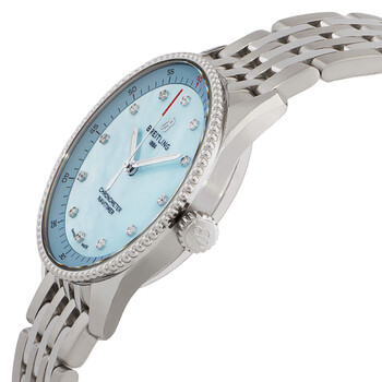 Silver-tone stainless steel case and bracelet. Fixed silver-tone stainless steel bezel. Pastel mother of pearl dial with silver-tone hands and diamond hour markers. Minute markers around the outer rim. Dial Type: Analog. Luminescent hands. Breitling Calibre 77 quartz movement. Scratch resistant sapphire crystal. Pull / push crown. Solid case back. Round case shape, case size: 32 mm, case thickness: 8 mm. Band width: 16 mm. Folding clasp. Water resistant at 50 meters / 165 feet. Functions: hour, minute, second, chronometer. Navitimer Series. Casual watch style. Watch label: Swiss Made. Breitling Navitimer Quartz Chronometer Diamond Ladies Watch A77320171C1A1.
