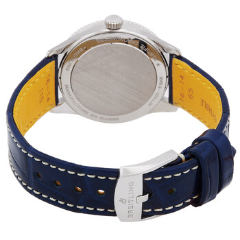 Silver-tone stainless steel case with a blue alligator leather strap. Fixed silver-tone stainless steel bezel. Pastel mother of pearl dial with silver-tone hands and diamond hour markers. Minute markers around the outer rim. Dial Type: Analog. Luminescent hands. Breitling Calibre 77 quartz movement. Scratch resistant sapphire crystal. Pull / push crown. Solid case back. Round case shape, case size: 32 mm, case thickness: 8 mm. Band width: 16/14 mm. Tang clasp. Water resistant at 50 meters / 165 feet. Functions: hour, minute, second, chronometer. Navitimer Series. Casual watch style. Watch label: Swiss Made. Breitling Navitimer Quartz Chronometer Diamond Ladies Watch A77320171C1P1.