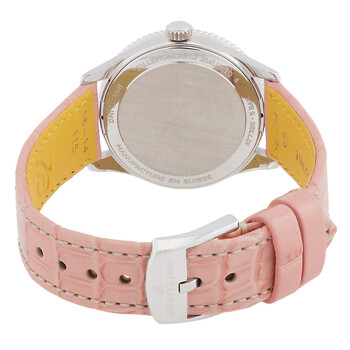 Silver-tone stainless steel case with a pink alligator leather strap. Bi-directional rotating silver-tone stainless steel bezel. Pink mother of pearl dial with silver-tone hands and diamond hour markers. Minute scale around the inner rim. Dial Type: Analog. Luminescent hands. Breitling Calibre 77 quartz movement. Scratch resistant sapphire crystal. Pull / push crown. Solid case back. Round case shape, case size: 32 mm, case thickness: 8 mm. Tang buckle clasp. Water resistant at 50 meters / 165 feet. Functions: hour, minute, second. Navitimer Series. Sport watch style. Watch label: Swiss Made. Breitling Navitimer Quartz Diamond Ladies Watch A77320D91K1P1.