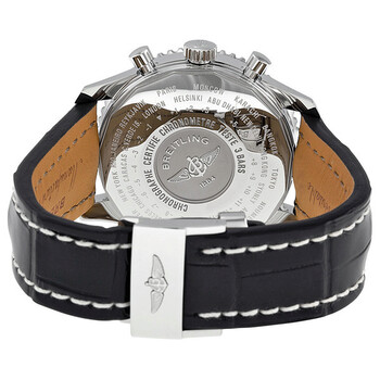 Stainless steel case with a black crocodile leather strap. Bidirectional stainless steel bezel. Black dial with luminous hands and index hour markers. Minute markers. Tachymeter scale around the outer rim. Dial Type: Analog. Date display at the 3 o'clock position. Chronograph - three sub-dials displaying: 60 second, 30 minute and 12 hour. Automatic movement. Scratch resistant sapphire crystal. Pull / push crown. Solid case back. Case diameter: 46 mm. Case thickness: 15.5 mm. Round case shape. Deployment clasp. Water resistant at 30 meters / 100 feet. Functions: tachymeter, chronograph, date, hour, minute, second. Luxury watch style. Watch label: Swiss Made. Breitling Navitimer World Black Dial Crocodile Leather Automatic Men's Watch A2432212-B726BKCD.
