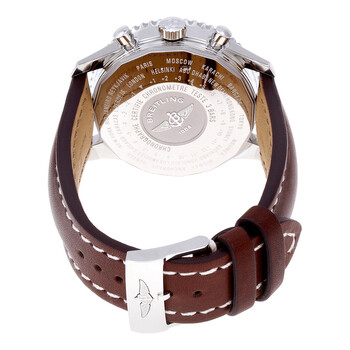 Silver-tone stainless steel case with a brown leather strap. Bi-directional rotating slide rule silver-tone stainless steel bezel. Black dial with luminous hands and stick hour markers. Minute markers around the outer rim. Dial Type: Analog. Luminescent hands and dial markers. Date display at the 3 o'clock position. Chronograph - three sub-dials displaying: 60 second, 30 minute and 12 hour. Breitling Calibre 24 automatic movement with a 42-hour power reserve. Scratch resistant sapphire crystal. Engraved major cities time zones case back. Round case shape, case size: 46 mm, case thickness: 15.5 mm. Band width: 24 mm, band length: 8.5 inches. Tang clasp. Water resistant at 30 meters / 100 feet. Functions: chronograph, GMT, second time zone, date, hour, minute, second, chronometer, nautical miles conversion scale. Additional Info: minute and hour totalizer, km/ miles/ nautical miles conversion scale. Luxury watch style. Watch label: Swiss Made. Item Variations: A2432212. Breitling Navitimer World Black Dial Men's Watch A2432212-B726BRLT.
