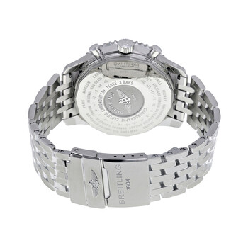 Stainless steel case with a stainless steel bracelet. Bidirectional ratcheting stainless steel bezel. Black dial with luminous hands and index hour markers. Minute markers. 24 hour markings. Mile / kilomter conversion scale. Dial Type: Analog. Luminescent hands and markers. Date display at the 3 o'clock position. Chronograph - three sub-dials displaying: 60 second, 30 minute and 12 hour. Self winding mechanical movement with a 42-hour power reserve. Scratch resistant chambered sapphire crystal. Non screw-locked crown with two gaskets. Screwed in case back. Case diameter: 46 mm. Case thickness: 15.5 mm. Round case shape. Band width: 20 mm / 24 mm. Band length: 8.5 inches. Deployment clasp. Water resistant at 30 meters / 100 feet. Functions: hours/ minutes/ seconds/ date/ chronograph/ 2nd time zone/ distance converter. Luxury Sport watch style. Watch label: Swiss Made. Breitling Navitimer World Black Dial Men's Watch A2432212-B726SS