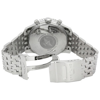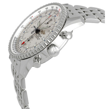 Stainless steel case with a stainless steel bracelet. Bi-directional ratating slide rule stainless steel bezel. Silver dial with luminous hands and index hour markers. Minute markers. 24 hour markers. Slide rule markings around the outer rim. Dial Type: Analog. Luminescent hands and dial markers. Date display at the 3 o'clock position. Chronograph - three sub-dials displaying: 12 hours, 30 minutes and 60 seconds. Breitling calibre 24 automatic movement with a 42-hour power reserve. Scratch resistant sapphire crystal. Non screw-locked crown with two gaskets. Screw in case back. Round case shape. Case size: 46 mm. Case thickness: 15.5 mm. Band width: 24 mm. Band length: 8.5 inches. Fold over clasp. Water resistant at 30 meters / 100 feet. Functions: chronograph, GMT, second time zone, date, hour, minute, second, chronometer, nautical miles conversion scale. Sport watch style. Watch label: Swiss made. Additional Information: "Slide Rule" aka "Navigation Computer" which allows to compute different airborne calculations such as fuel consumption, climbing times & converting miles into nautical miles or kilomters. Item Variations: A2432212, A2432212.G571, a2432212g571ss. Breitling Navitimer World Chronograph Automatic Chronometer Silver Dial Men's Watch A2432212-G571-453A.