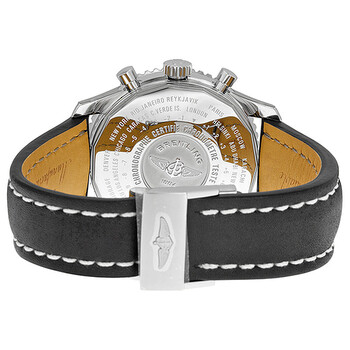 Stainless steel case with a black leather strap. Bi-directional rotating stainless steel bezel. Blue dial with silver-tone hands and index hour markers. Minute markers. 24 hour (GMT) markings. Silide rule markings around the outer rim. Dial Type: Analog. Luminescent hands and markers. Date display at the 3 o'clock position. Chronograph - three sub-dials displaying: 60 second, 30 minute and 12 hour. Automatic movement. Scratch resistant sapphire crystal. Pull / push crown. Solid case back. Case diameter: 46 mm. Case thickness: 15.5 mm. Round case shape. Double locking fold over clasp. Water resistant at 30 meters / 100 feet. Functions: chronograph, date, hour, minute, second. Luxury watch style. Watch label: Swiss Made. Breitling Navitimer World Chronograph Blue Dial Black Leather Men's Watch A2432212-C651BKLD.