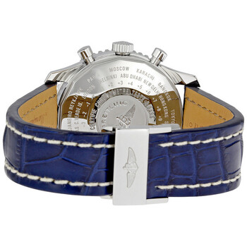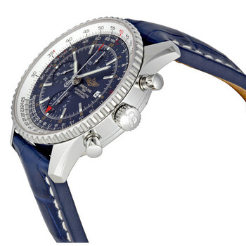 Stainless steel case with a blue croco-embossed strap strap with contrast stiching. Bi-directional rotating stainless steel bezel. Blue dial with luminous hands and index hour markers. 24 hour (GMT) markings. Minute markers. Mile / kilometer conversion scale. Dial Type: Analog. Date display at the 3 o'clock position. Chronograph - three sub-dials displaying: 12 hours, 30 minutes and 60 seconds. Automatic movement with a 42-hour power reserve. Scratch resistant sapphire crystal. Solid case back. Case diameter: 46 mm. Case thickness: 15.50 mm. Folding clasp. Water resistant at 30 meters / 100 feet. Functions: hours, minutes, seconds, date, chronograph, nautical miles conversion scale, GMT,. Additional Info: chronograph; GMT 2nd time zone. Luxury Sport watch style. Breitling Navitimer World Blue Dial Chronograph Men's Watch A2432212-C651BLCD.