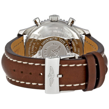 Stainless steel case with a brown leather strap. Bidirectional rotating stainless steel bezel with slide rule. Silver dial with luminous hands and luminous stick hour markers. GMT markings. Mile / kilometer conversion. Minute markers around the outer rim. Dial Type: Analog. Luminescent hands and dial markers. Date display at 3 o'clock position. Chronograph - three sub-dials displaying: 60 seconds, 30 minutes and 12 hours. Automatic movement. Scratch resistant sapphire crystal. Non screw-locked crown with two gaskets. Solid case back. Case diameter: 46mm. Case thickness: 15.5mm. Band width: 24-20mm. Tang clasp. Water resistant at 30 meters / 100 feet. Functions: hours/ minutes/ seconds/ date/ chronograph/ world time/ 2nd time zone/ distance converter. Breitling Navitimer World Steel Brown Strap Watch A2432212-G571BRLT.