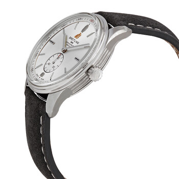 Stainless steel case with a anthracite (nubuck) leather strap. Fixed stainless steel bezel. Silver dial with silver-tone hands and index hour markers. Minute markers around the outer rim. Dial Type: Analog. Small seconds syb-dial. Breitling calibre 17 automatic movement, based upon ETA 2824-2, containing 25 Jewels, bitting at 28800 vph, and has a power reserve of approximately 42 hours. Scratch resistant sapphire crystal. Pull / push crown. Solid case back. Round case shape. Case size: 40 mm. Case thickness: 11.4 mm. Band width: 20 mm. Fold over clasp with a push button release. Water resistant at 100 meters / 330 feet. Functions: date, hour, minute, small second. Premier Automatic 40 Series. Luxury watch style. Watch label: Swiss Made. Breitling Premier Automatic 40 Silver Dial Watch A37340351G1X1.