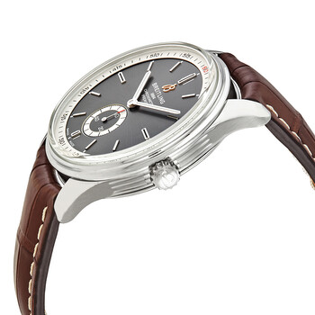 Stainless steel case with a brown (crocodile) leather strap. Fixed stainless steel bezel. Anthracite dial with silver-tone hands and index hour markers. Minute markers around the outer rim. Dial Type: Analog. Small second sub-dial above the 6 o'clock position. Breitling calibre 37 automatic movement with a 42-hour power reserve. Scratch resistant sapphire crystal. Pull / push crown. Solid case back. Round case shape. Case size: 40 mm. Case thickness: 11.40 mm. Band width: 20 mm. Tang clasp. Water resistant at 100 meters / 330 feet. Functions: hour, minute, small second, chronometer. Luxury watch style. Watch label: Swiss Made. Breitling Premier Automatic Chronometer Men's Watch A37340351B1P2.