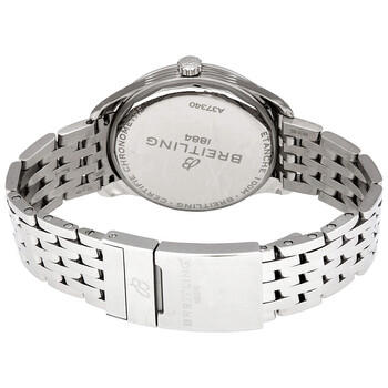 Stainless steel case with a stainless steel bracelet. Fixed stainless steel bezel. Silver dial with luminous silver-tone hands and index hour markers. Arabic numeral minute markers (at 5 minute intervals). Minute markers around the outer rim. Dial Type: Analog. Luminescent hands and markers. Small seconds sub-dial. Breitling calibre 37 automatic movement with a 42-hour power reserve. Scratch resistant sapphire crystal. Pull / push crown. Solid case back. Round case shape. Case size: 40 mm. Case thickness: 11.40 mm. Band width: 20 mm. Deployment clasp with a push button release. Water resistant at 100 meters / 330 feet. Functions: hour, minute, small second, chronometer. Luxury watch style. Watch label: Swiss Made. Breitling Premier Automatic Chronometer Silver Dial Men's Watch A37340351G1A1.
