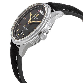 Stainless steel case with a black (calfskin) leather strap. Fixed stainless steel bezel. Black dial with luminous rose gold-tone hands and index hour markers. Minute markers around the outer rim. Dial Type: Analog. Luminescent hands and markers. Date display at the 6 o'clock position. Day of the week display centered on the 12 o'clock position. Breitling calibre 45 automatic movement, based upon ETA 2834-2, containing 25 Jewels, bitting at 28800 vph, and has a power reserve of approximately 42 hours. Scratch resistant sapphire crystal. Pull / push crown. Solid case back. Round case shape, case size: 40 mm, case thickness: 11.4 mm. Band width: 20 mm / 18 mm. Tang clasp. Water resistant at 100 meters / 330 feet. Functions: date, day, hour, minute, second. Premier automatic day and date series. Luxury watch style. Watch label: Swiss Made. Breitling Premier Automatic Day and Date Chronometer Black Dial Watch A45340241B1X4.