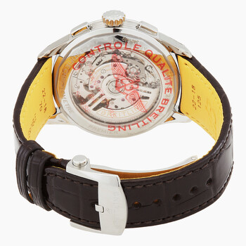 Silver-tone stainless steel case with a dark brown alligator band. Fixed silver-tone stainless steel bezel. Brown dial with silver-tone hands and Arabic numeral hour markers. Minute markers around the outer rim. Dial Type: Analog. Date display at the 6 o'clock position. Chronograph - two sub-dials displaying: 60 second and 30 minute. Breitling Calibre 01 Automatic movement, containing 47 Jewels, composed of 346 parts, bitting at 28800 vph, and has a power reserve of approximately 70 hours. Scratch resistant sapphire crystal. Pull / push crown. Transparent see through case back. Round case shape, case size: 42 mm. Fold over clasp with a safety release. Water resistant at 100 meters / 330 feet. Functions: chronograph, column wheel, date, hour, minute, second, chronometer. Additional Info: original box, international warranty card, manual (complete accessories). Premier B01 Series. Luxury watch style. Watch label: Swiss Made. Breitling Premier B01 Chronograph 42 Automatic Chronometer Brown Dial Men's Watch AB0145331K1P1.