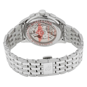 Silver-tone stainless steel case and bracelet. Fixed silver-tone stainless steel bezel. Green dial with silver-tone hands and Arabic numeral hour markers. Minute markers around the outer rim. Dial Type: Analog. Luminescent hands. Date display at the 6 o'clock position. Chronograph - three sub-dials displaying: 60 second, 30 minute and 12 hour. Breitling Calibre 01 Automatic movement, containing 47 Jewels, composed of 346 parts, bitting at 28800 vph, and has a power reserve of approximately 70 hours. Scratch resistant sapphire crystal. Pull / push crown. Transparent see through case back. Round case shape, case size: 42 mm. Fold over clasp with a safety release. Water resistant at 100 meters / 330 feet. Functions: chronograph, column wheel, date, hour, minute, second, chronometer. Additional Info: original box, international warranty card, manual (complete accessories). Premier Series. Luxury watch style. Watch label: Swiss Made. Breitling Premier Chronograph Automatic Chronometer Green Dial Men's Watch AB0145371L1A1.