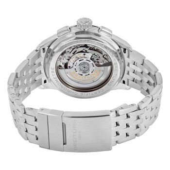 Stainless steel case with a stainless steel bracelet. Fixed stainless steel bezel. Blue dial with luminous silver-tone hands and index hour markers. Minute markers. Tachymeter markings around the outer rim. Dial Type: Analog. Luminescent hands and markers. Date display at the o'clock position. Chronograph - three sub-dials displaying: 60 second, 30 minute and 12 hour. Breitling calibre 01 automatic movement, containing 47 Jewels, composed of 346 parts, bitting at 28800 vph, and has a power reserve of approximately 70 hours. Scratch resistant sapphire crystal. Pull / push crown. Transparent case back. Round case shape. Case size: 42 mm. Case thickness: 13.65 mm. Band width: 22 mm. Fold over clasp. Water resistant at 100 meters / 330 feet. Functions: chronograph, column wheel, date, hour, minute, second, chronometer. Luxury watch style. Watch label: Swiss Made. Breitling Premier B01 Chronograph Automatic Chronometer Blue Dial Men's Watch AB0118221C1A1.