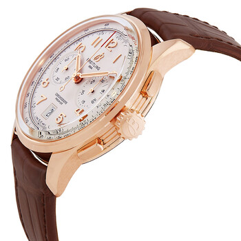 Rose gold-tone 18kt rose gold case with a brown alligator leather strap. Fixed rose gold-tone rose gold-tone bezel. Rose gold-tone dial with rose gold-tone hands and index-Arabic numeral hour markers. Minute scale around the inner rim. Dial Type: Analog. Date display at the 6 o'clock position. Chronograph - three sub-dials displaying: 60 second, 30 minute and 1/10th of a second. Breitling Calibre 01 Automatic movement, containing 47 Jewels, composed of 346 parts, bitting at 28800 vph, and has a power reserve of approximately 70 hours. Scratch resistant sapphire crystal. Pull / push crown. Transparent see through case back. Round case shape, case size: 42 mm, case thickness: 13.6 mm. Band width: 22 mm. Folding clasp. Water resistant at 100 meters / 330 feet. Functions: chronograph, date, hour, minute, second. Premier Series. Dress watch style. Watch label: Swiss Made. Breitling Premier B01 Chronograph Automatic Rose Gold Dial Men's Watch RB0145371G1P2.