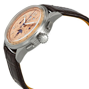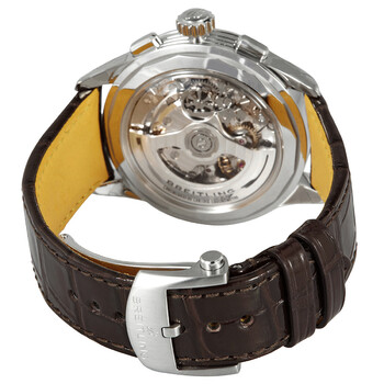 Stainless steel case with a brown leather strap. Fixed stainless steel bezel. Brown dial with luminous silver-tone hands and Arabic numeral hour markers. Minute markers. Tachymeter markings around the outer rim. Dial Type: Analog. Luminescent hands and markers. Day of the week and month display below the 12 o'clock position. Chronoppgraph - two sub-dials displaying: 60 second and 30 minute. Date / moonphase subv-dial. Breitling calibre 25 automatic movement, based upon ETA 2892-A2, containing 21 Jewels, bitting at 28800 vph, and has a power reserve of approximately 42 hours. Scratch resistant sapphire crystal. Pull / push crown. Transparent case back. Round case shape. Case size: 42 mm. Case thickness: 15.3 mm. Band width: 22 mm. Fold over clasp. Water resistant at 100 meters / 330 feet. Functions: chronograph, tachymeter, date, hour, minute, small second. Additional Info: original box, manual (complete accessories). Premier B25 Datora Series. Luxury watch style. Watch label: Swiss Made. Breitling Premier B25 Datora Chronograph Automatic Brown Dial Men's Watch AB2510201K1P1.
