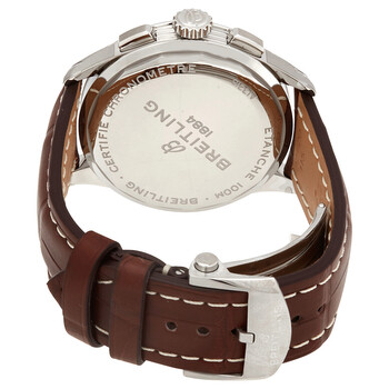 Stainless steel case with a brown (crocodile) leather strap. Fixed stainless steel bezel. Blue dial with luminous silver-tone hands and index hour markers. Minute markers. tachymeter markings around the outer rim. Dial Type: Analog. Luminescent hands and markers. Date display at the 6 o'clock position. Chronograph - three sub-dials displaying: 60 seconds, 30 minutes, and 12 hours. Breitling calibre 13 automatic movement, based upon ETA Valjoux 7750, containing 25 Jewels, bitting at 28800 vph, and has a power reserve of approximately 42 hours. Scratch resistant sapphire crystal. Pull / push crown. Solid case back. Round case shape. Case size: 42 mm. Case thickness: 13.80 mm. Band width: 22 mm. Fold over clasp. Water resistant at 100 meters / 330 feet. Functions: chronograph, date, hour, minute, second, chronometer. Luxury watch style. Watch label: Swiss Made. Breitling Premier Chronograph Automatic Chronometer Blue Dial Men's Watch A13315351C1P1.