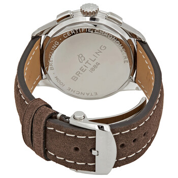 Stainless steel case with a brown (nubuck) leather strap. Fixed stainless steel bezel. Blue dial with luminous silver-tone hands and index hour markers. Minute markers. Tachymeter markings around the outer rim. Dial Type: Analog. Luminescent hands and markers. Date display at the 6 o'clock position. Chronograph - three sub-dials displaying: 60 seconds, 30 minutes, and 12 hours. Breitling calibre 13 automatic movement, based upon ETA Valjoux 7750, containing 25 Jewels, bitting at 28800 vph, and has a power reserve of approximately 42 hours. Scratch resistant sapphire crystal. Pull / push crown. Solid case back. Round case shape. Case size: 42 mm. Case thickness: 13.80 mm. Band width: 22 mm. Fold over clasp with a push button release. Water resistant at 100 meters / 330 feet. Functions: chronograph, date, hour, minute, second, chronometer. Luxury watch style. Watch label: Swiss Made. Breitling Premier Chronograph Automatic Chronometer Blue Dial Men's Watch A13315351C1X1.