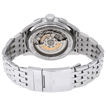 Stainless steel case with a stainless steel bracelet. Fixed stainless steel bezel. Blue dial with luminous silver-tone hands and index hour markers. Minute markers. Tachymeter markings around the outer rim. Dial Type: Analog. Luminescent hands and markers. Date display at the 6 o'clock position. Chronograph - two grey sub-dials displaying: 60 second and 30 minute. Breitling calibre 01 automatic movement, containing 47 Jewels, composed of 346 parts, bitting at 28800 vph, and has a power reserve of approximately 70 hours. Scratch resistant sapphire crystal. Pull / push crown. Transparent case back. Round case shape. Case size: 42 mm. Case thickness: 13.65 mm. Band width: 22 mm. Deployment clasp with a push button release. Water resistant at 100 meters / 330 feet. Functions: chronograph, column wheel, date, hour, minute, second, chronometer. Luxury watch style. Watch label: Swiss Made. Breitling Premier Chronograph Automatic Chronometer Blue Dial Men's Watch AB0118A61C1A1.