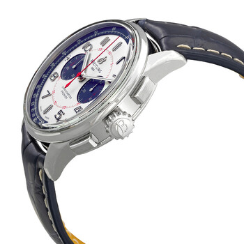 Silver-tone stainless steel case with a blue (alligator) leather strap. Fixed silver-tone stainless steel bezel. White dial with silver-tone hands and Arabic numeral hour markers. Minute markers. Tachymeter markings around the outer rim. Dial Type: Analog. Chronograph - two sub-dials displaying: 60 second and 30 minute. Breitling Calibre 01 Automatic movement, containing 47 Jewels, composed of 346 parts, bitting at 28800 vph, and has a power reserve of approximately 70 hours. Scratch resistant sapphire crystal. Screw down crown. Transparent case back. Round case shape, case size: 42 mm, case thickness: 13.65 mm. Band width: 22 mm. Folding clasp. Water resistant at 100 meters / 330 feet. Functions: chronograph, tachymeter, hour, minute, second. Additional Info: limited edition. Premier Series. Dress watch style. Watch label: Swiss Made. Breitling Premier Chronograph Automatic White Dial Men's Watch AB0118A71G1P1.