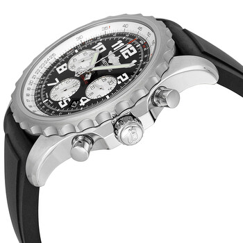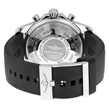 Stainless steel case with a black rubber "pro diver" strap. Bi-directional rotating stainless steel bezel. Black dial with silver-tone hands and Arabic numeral hour markers. Minute markers. Navigation computer markings around the outer rim. Dial Type: Analog. Luminescent hands and markers. Date display between 4 and 5 o'clock position. Chronograph - three sub-dials displaying: 60 second, 30 minute and 1/10th of a second. Automatic movement with 42 hour power reserve. Scratch resistant sapphire crystal. Screw locked crown. Solid case back. Case diameter: 46 mm. Case thickness: 16 mm. Round case shape. Tang clasp. Water resistant at 200 meters / 660 feet. Functions: chronograph, date, hour, minute, second. Luxury watch style. Watch label: Swiss Made. Slide rule' aka 'navigation computer' which allows computing different airborne calculations such as fuel consumption, climbing times and converting miles into nautical miles or kilometers. Breitling Professional Chronospace Black Dial Automatic Men's Watch A2336035-BB97BKPT.